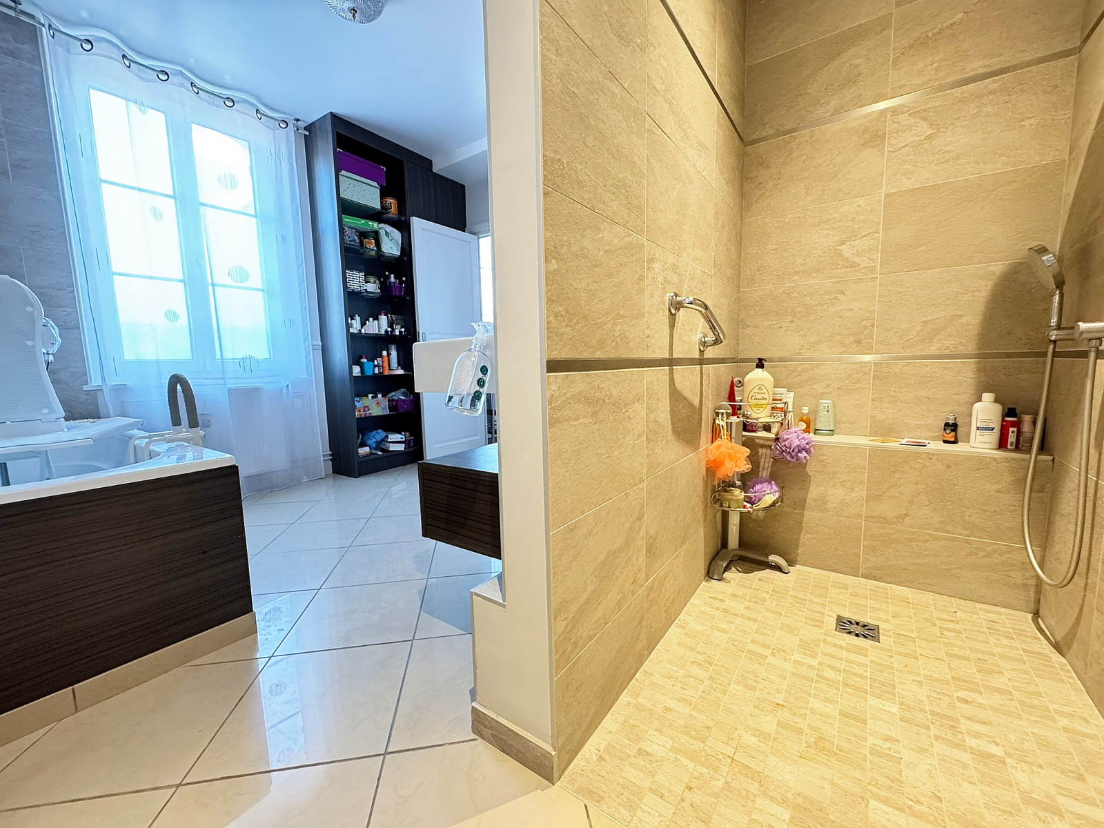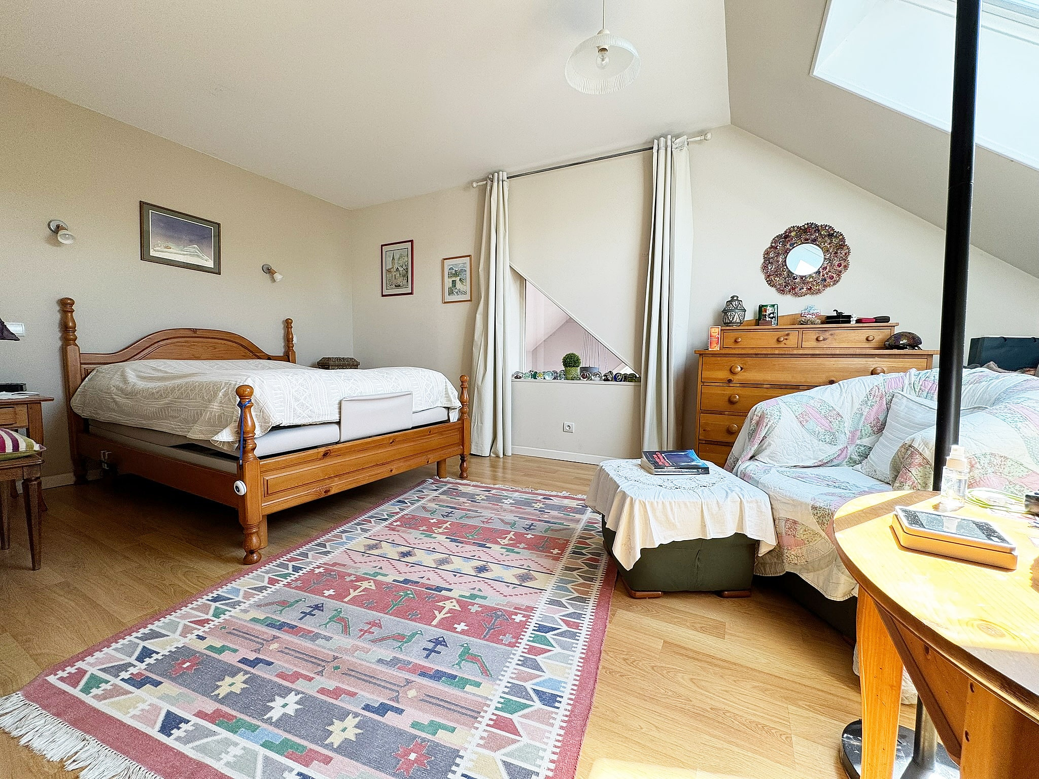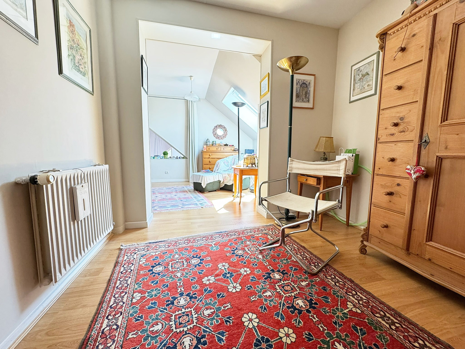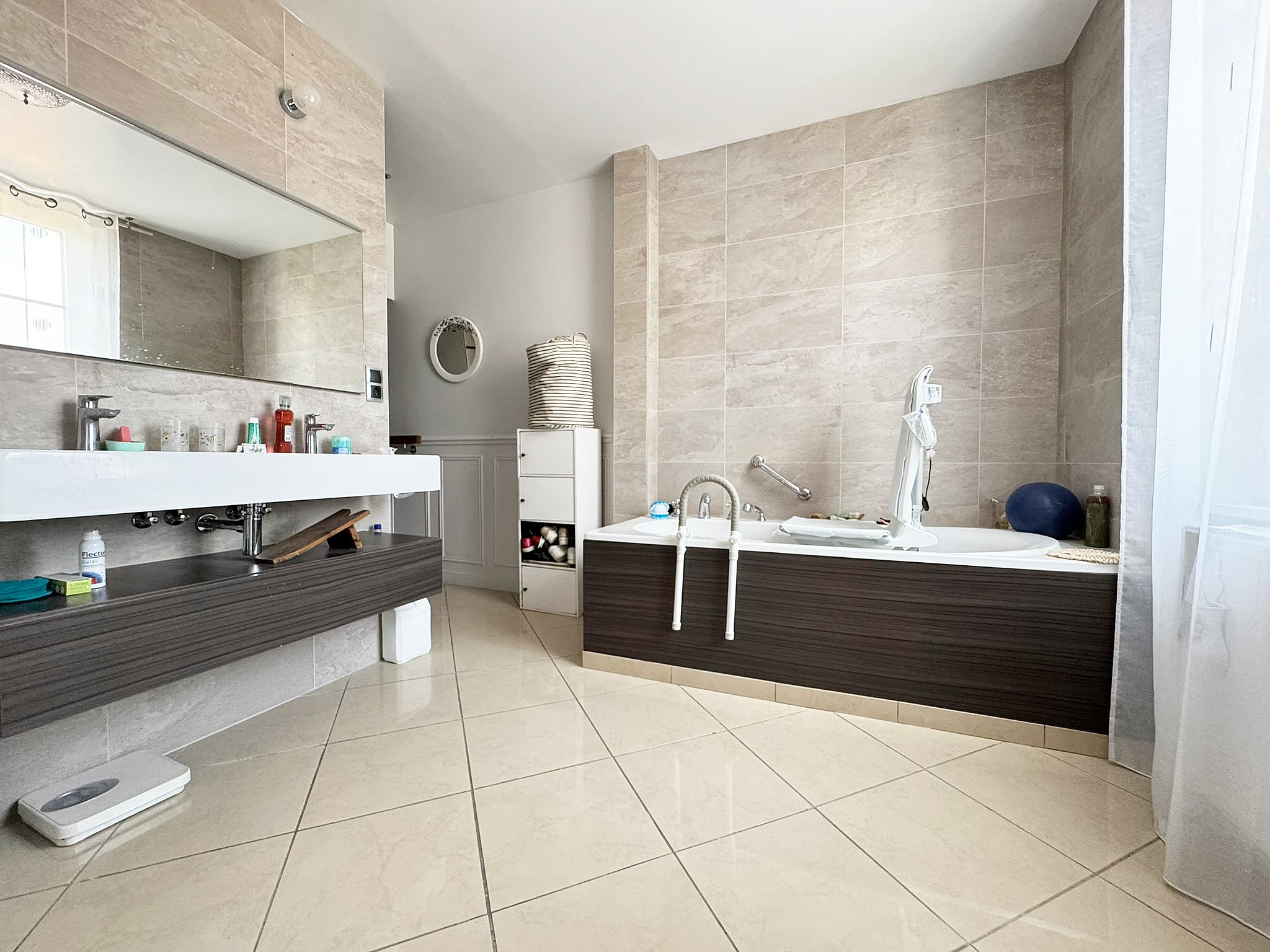 • Au demi-palier : Deux chambres en enfilades (23 m²/17 m²), placards, salle de bains avec baignoire et douche à l’italienne, wc séparé et buanderie.