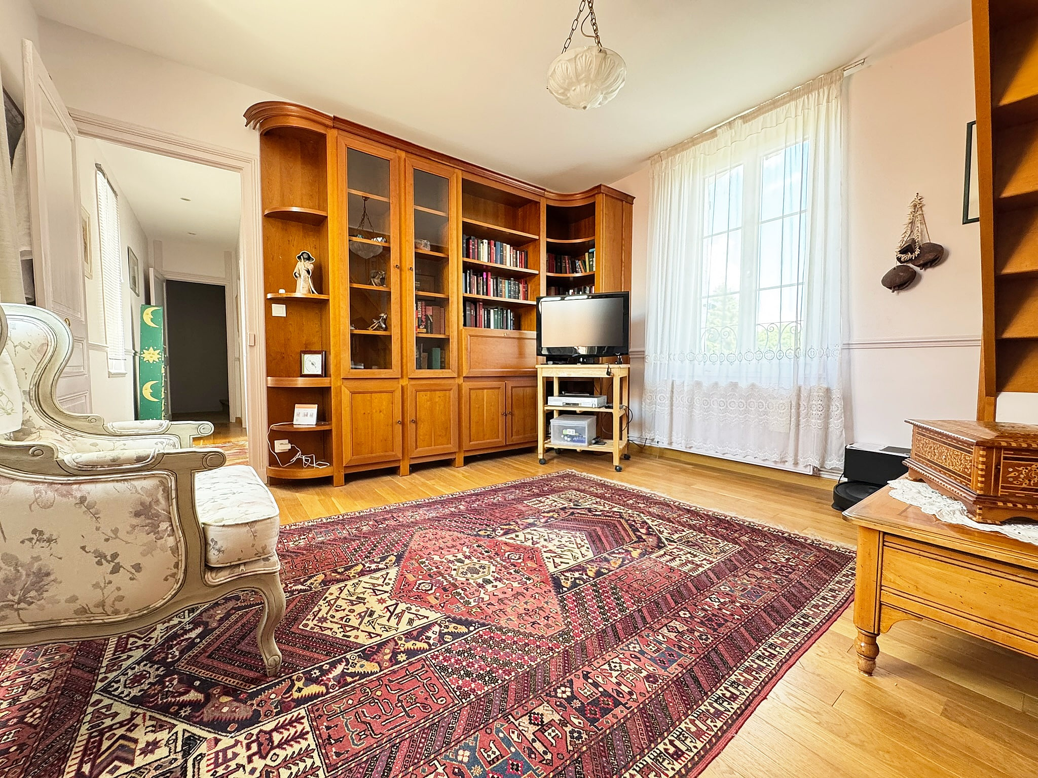 • Au 1er étage sur la droite : Couloir desservant pièce dressing (14 m²) et wc séparé, bibliothèque (14 m²) donnant accès à une chambre (14 m²), puis à une autre chambre sous combles au-dessus (10 m²).