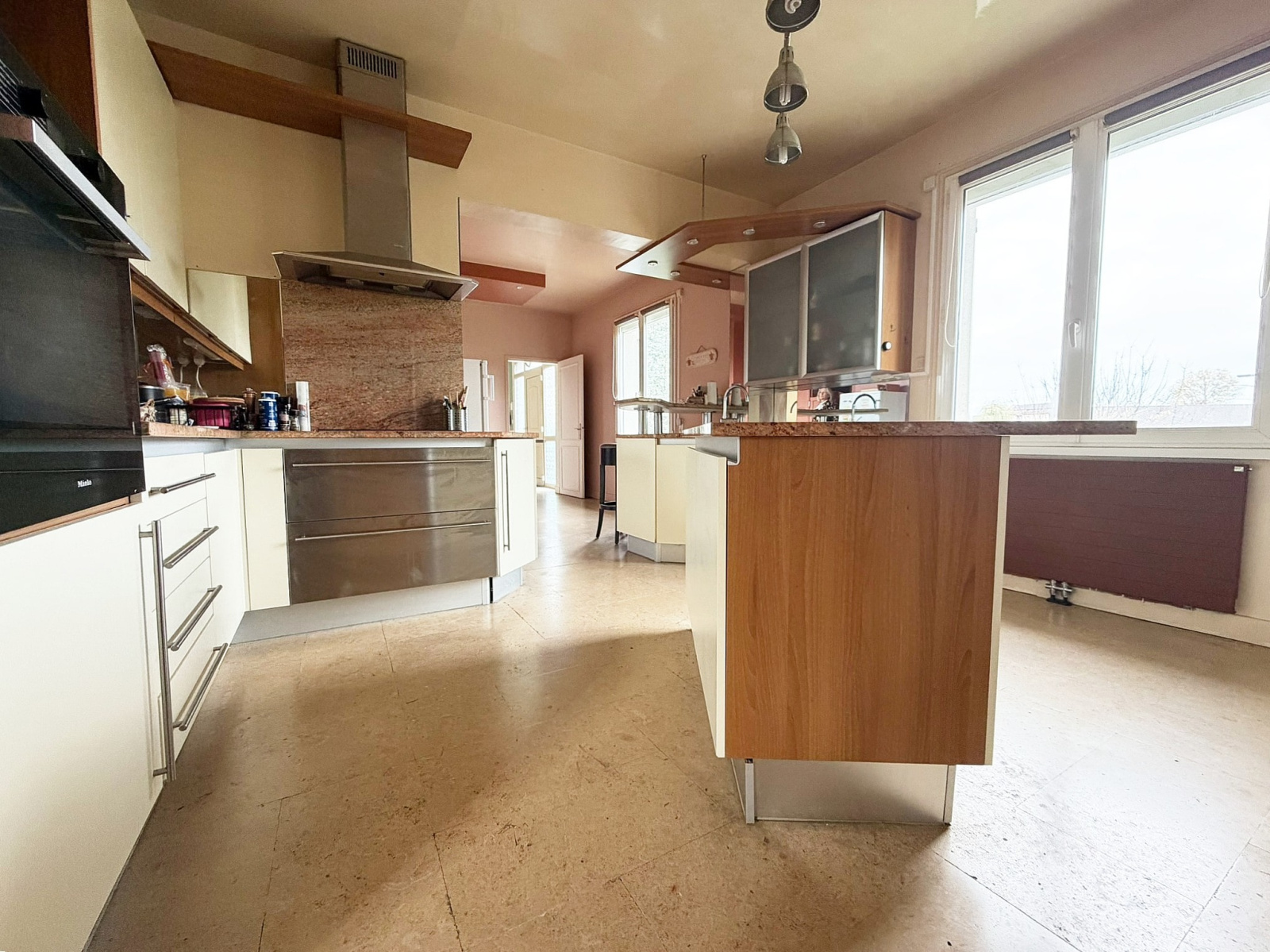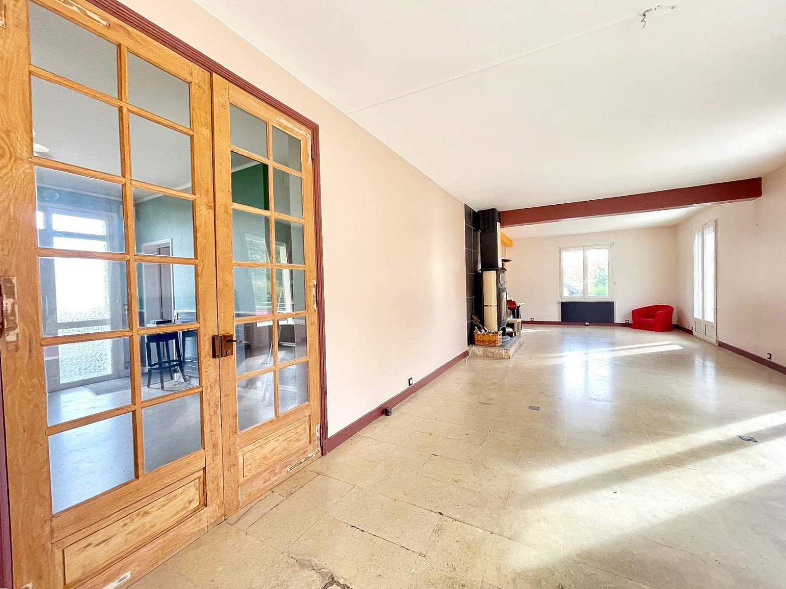 • Elle se compose d'une belle entrée généreuse avec placard, un grand salon séjour lumineux de plus de 50 m² avec poêle à bois et un accès direct sur sa superbe terrasse de 80 m² donnant sur les espaces verts.