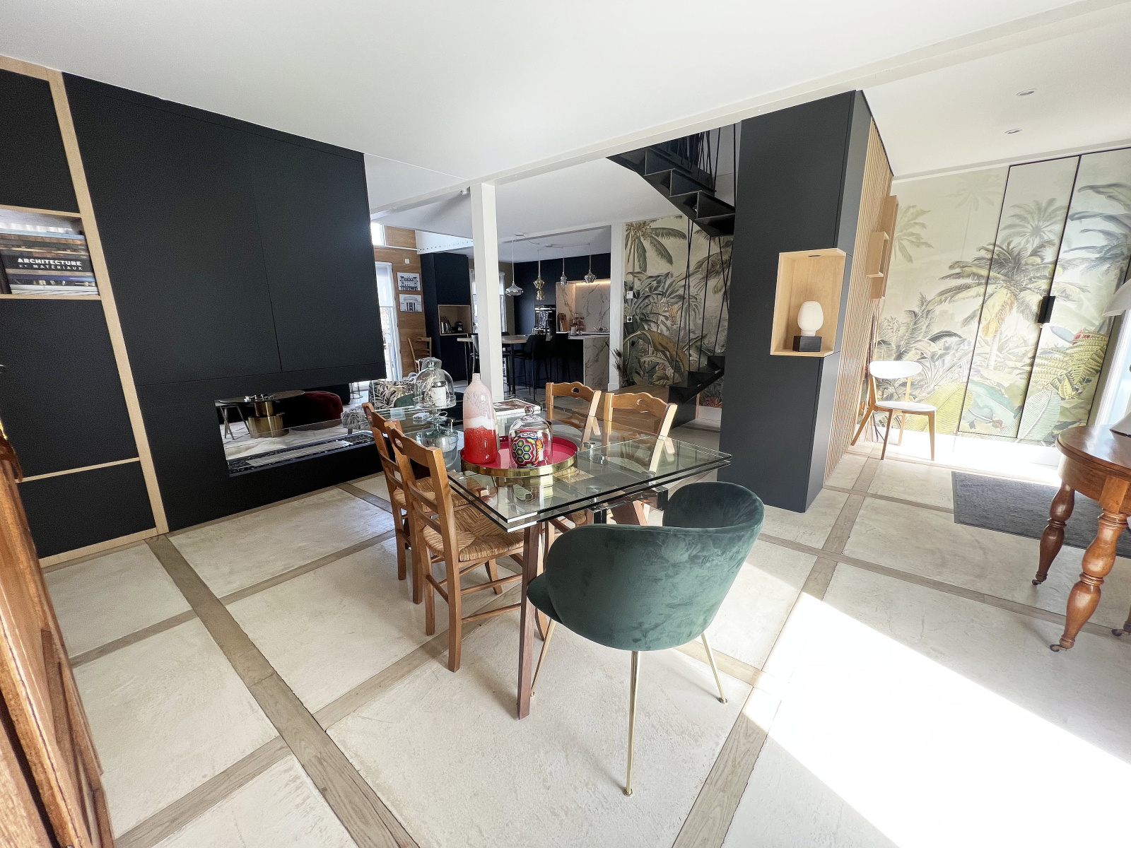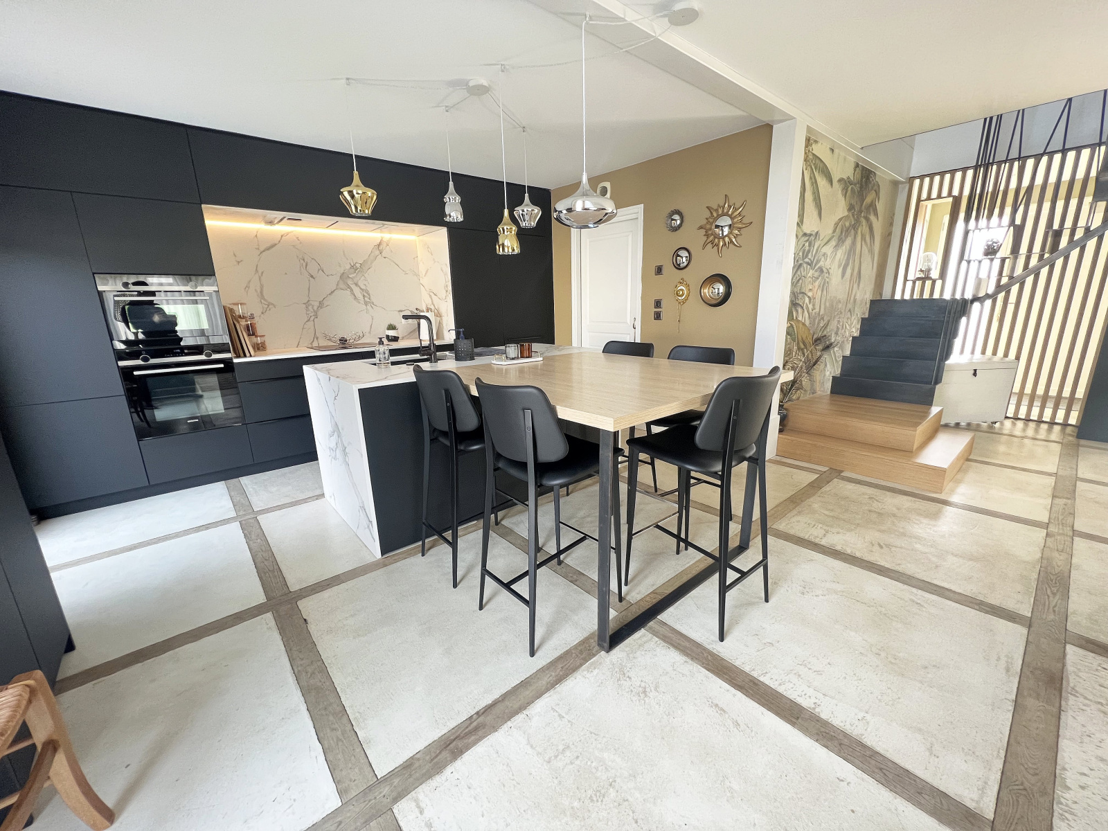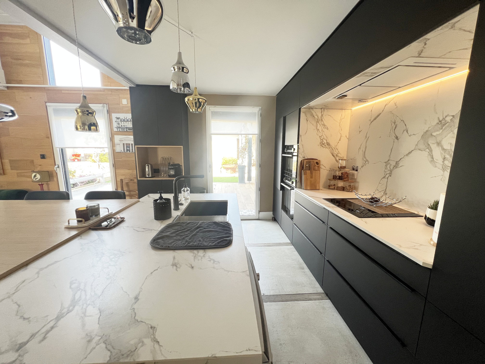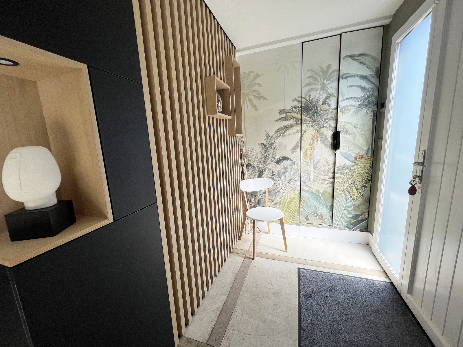 au rez-de-chaussée : Entrée avec placard, un sublime espace ouvert de 62 m² avec séjour, salle à manger et cuisine équipée, buanderie/arrière-cuisine (10 m²) et wc séparé.
