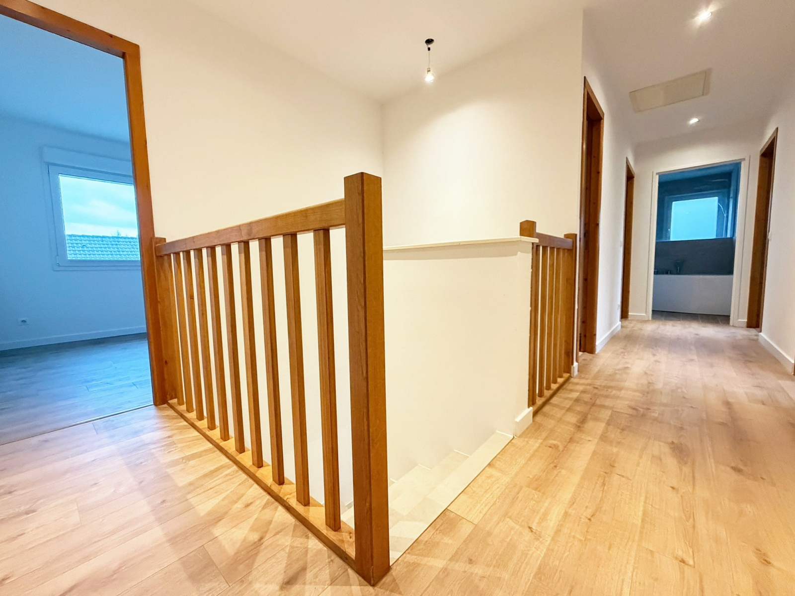 • À l'étage : 4 belles chambres (superficies de 12 m² à 19 m²), une grande salle de bains lumineuse (douche et baignoire), wc, une grande pièce de 30 m² servant de grenier et pouvant être aménagée.
