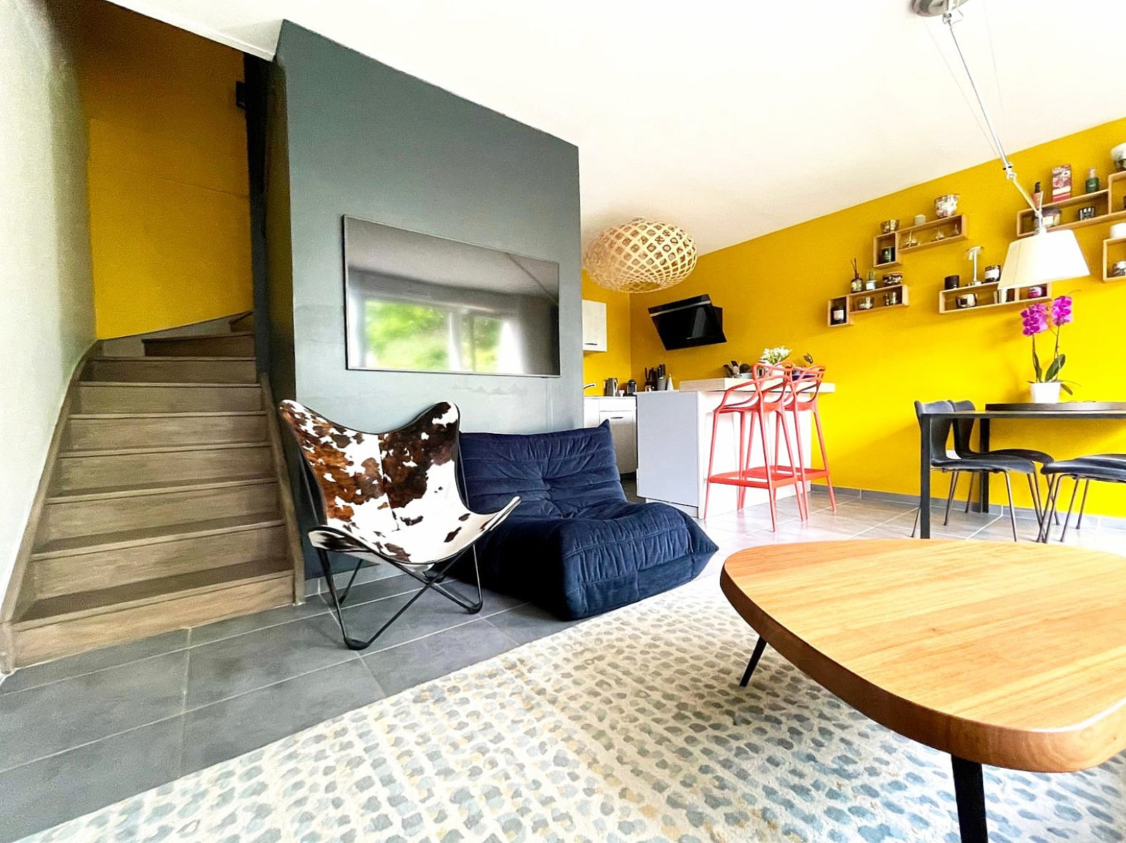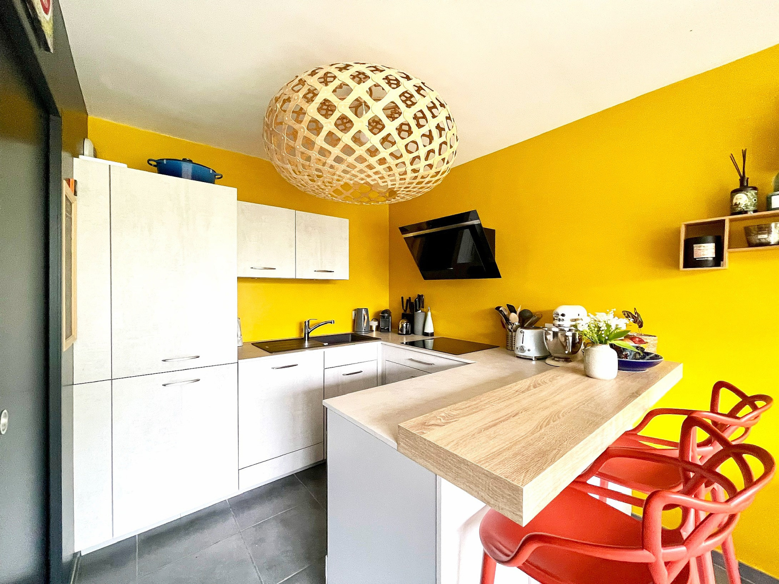 Joliment décorée elle se présente avec une entrée, des rangements, une pièce de vie lumineuse qui rejoint la cuisine ouverte équipée et meublée, un cellier et un wc séparé.