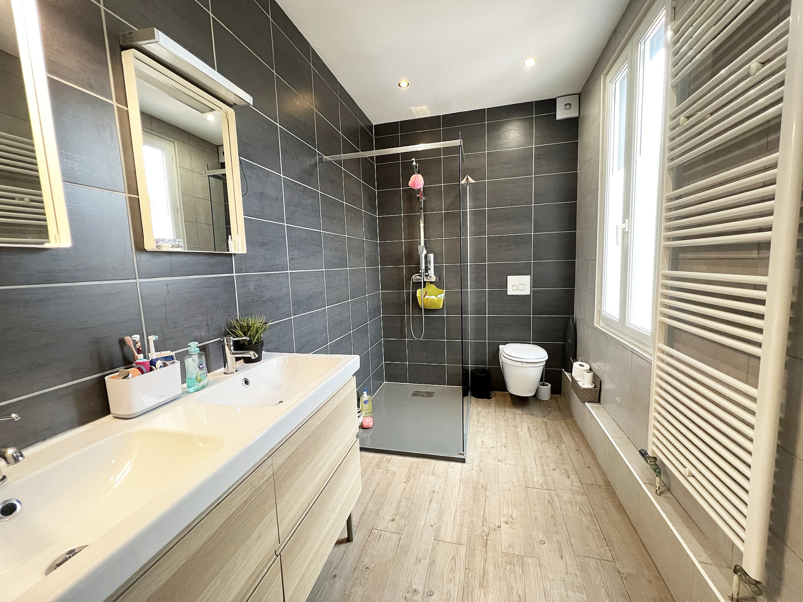 1er étage : Palier avec dressing, grande chambre (13,41 m²), belle salle d’eau avec double vasque, fenêtre et wc.