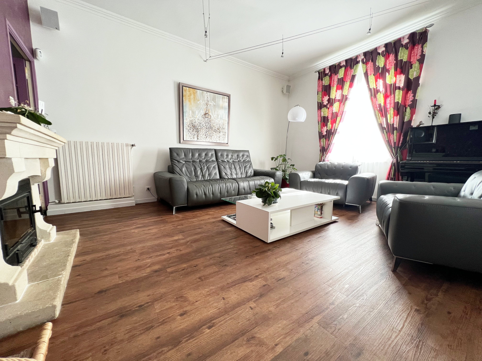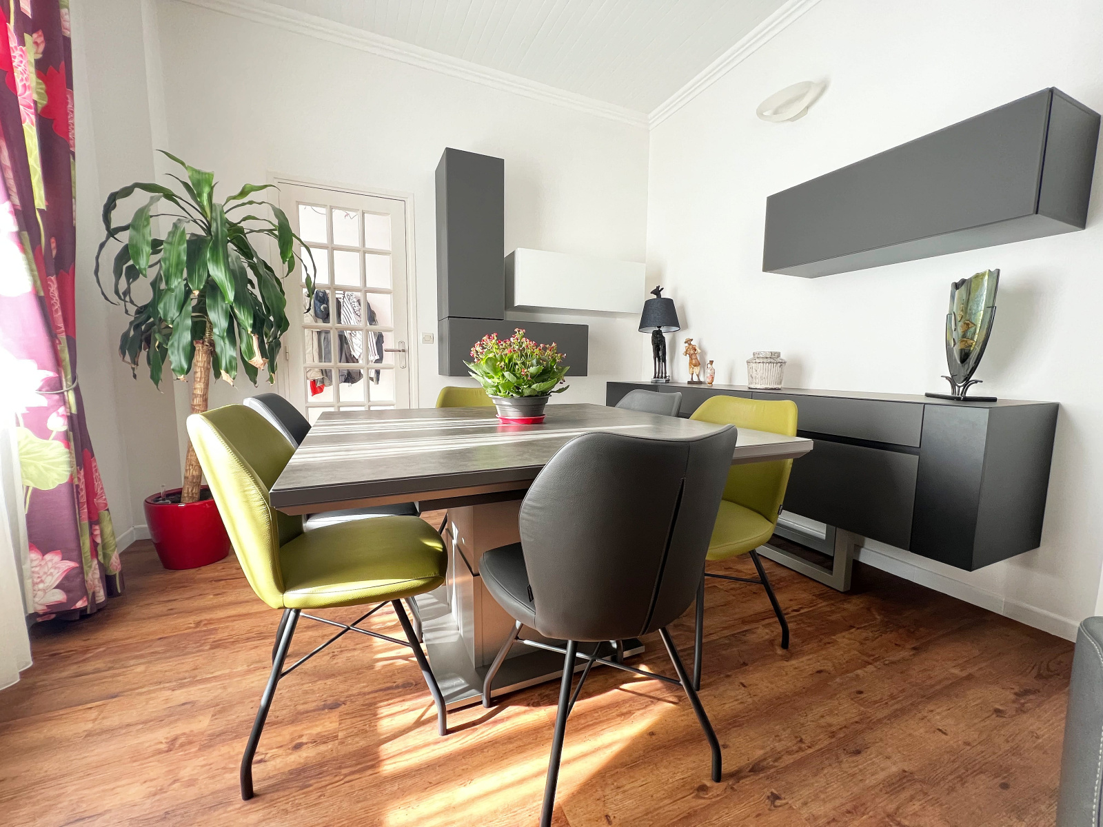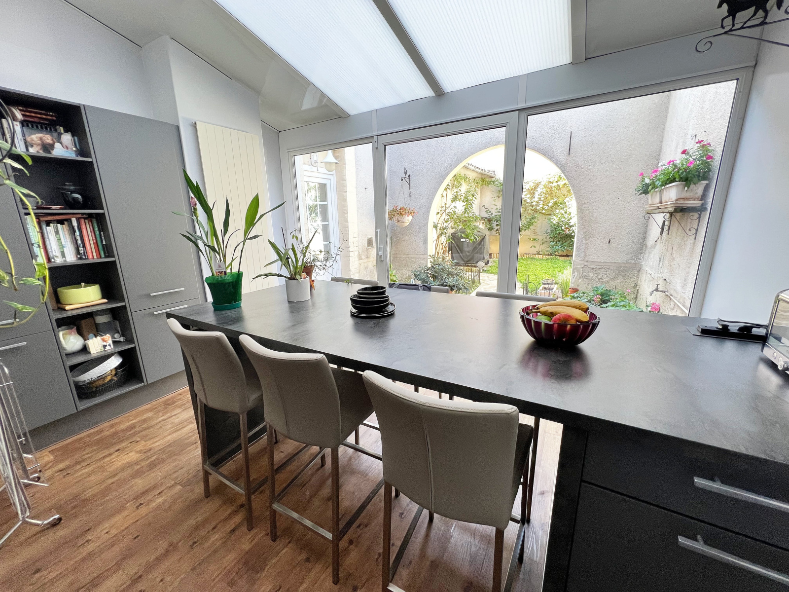 Rdc : Entrée, espace de 32 m² avec salon - salle à manger, belle cuisine moderne aménagée et équipée ouverte sur son espace repas aménagé avec véranda (24 m²) et accès à la terrasse, nombreux placards et cellier.
