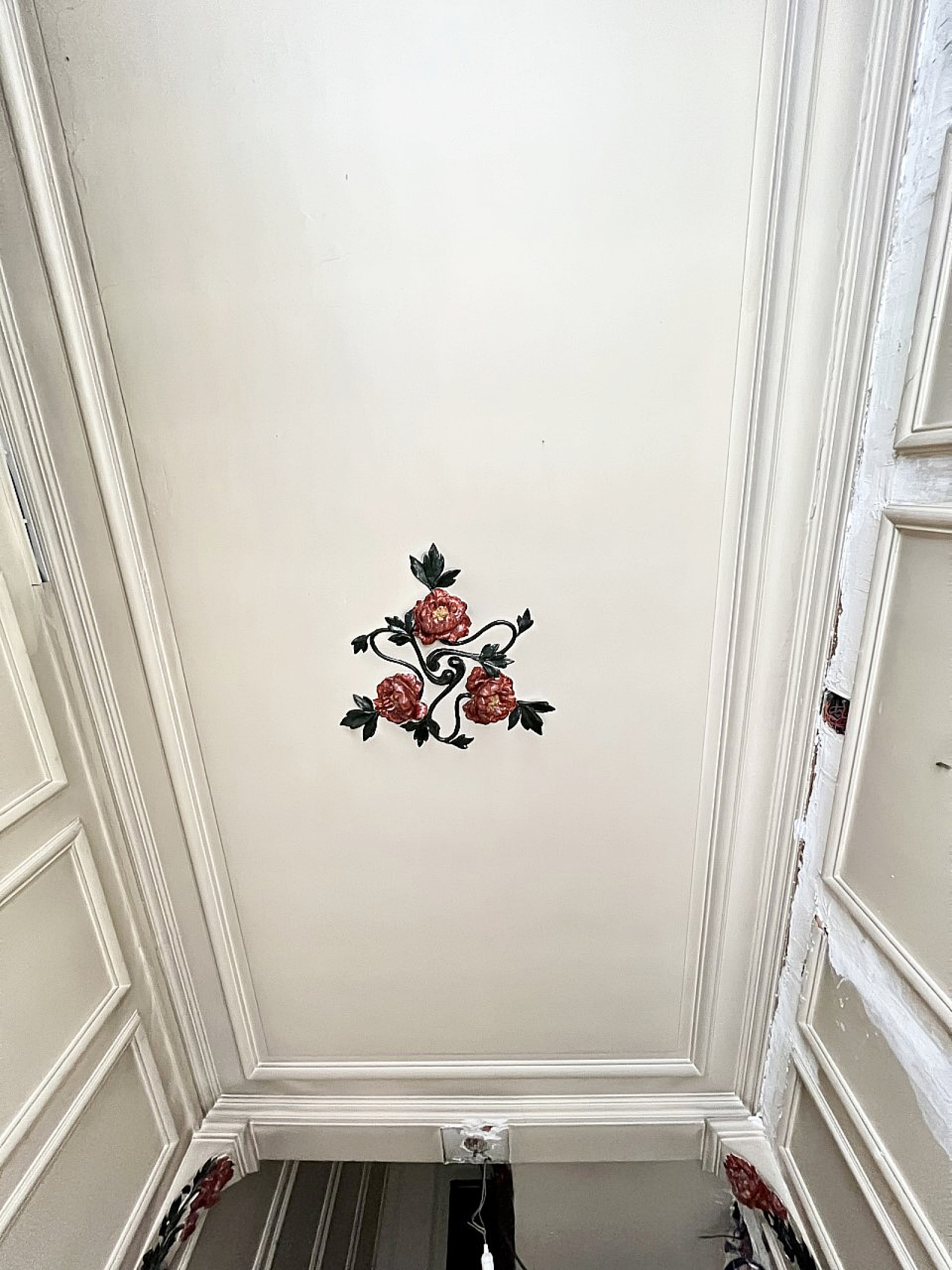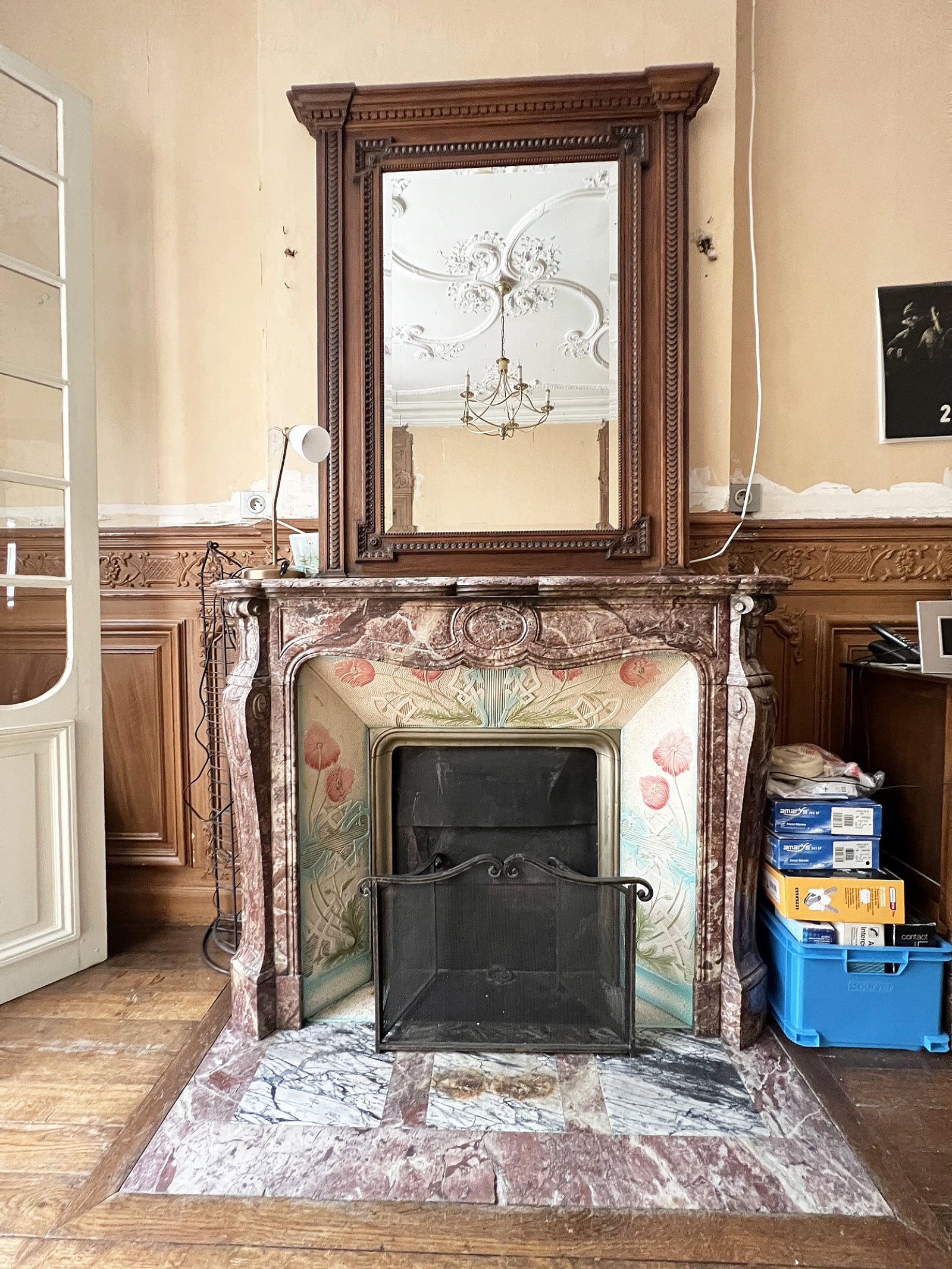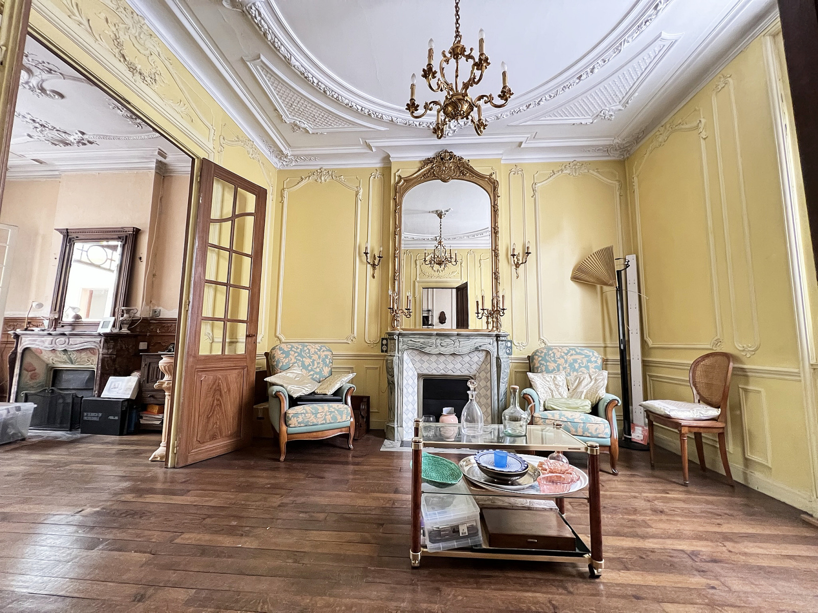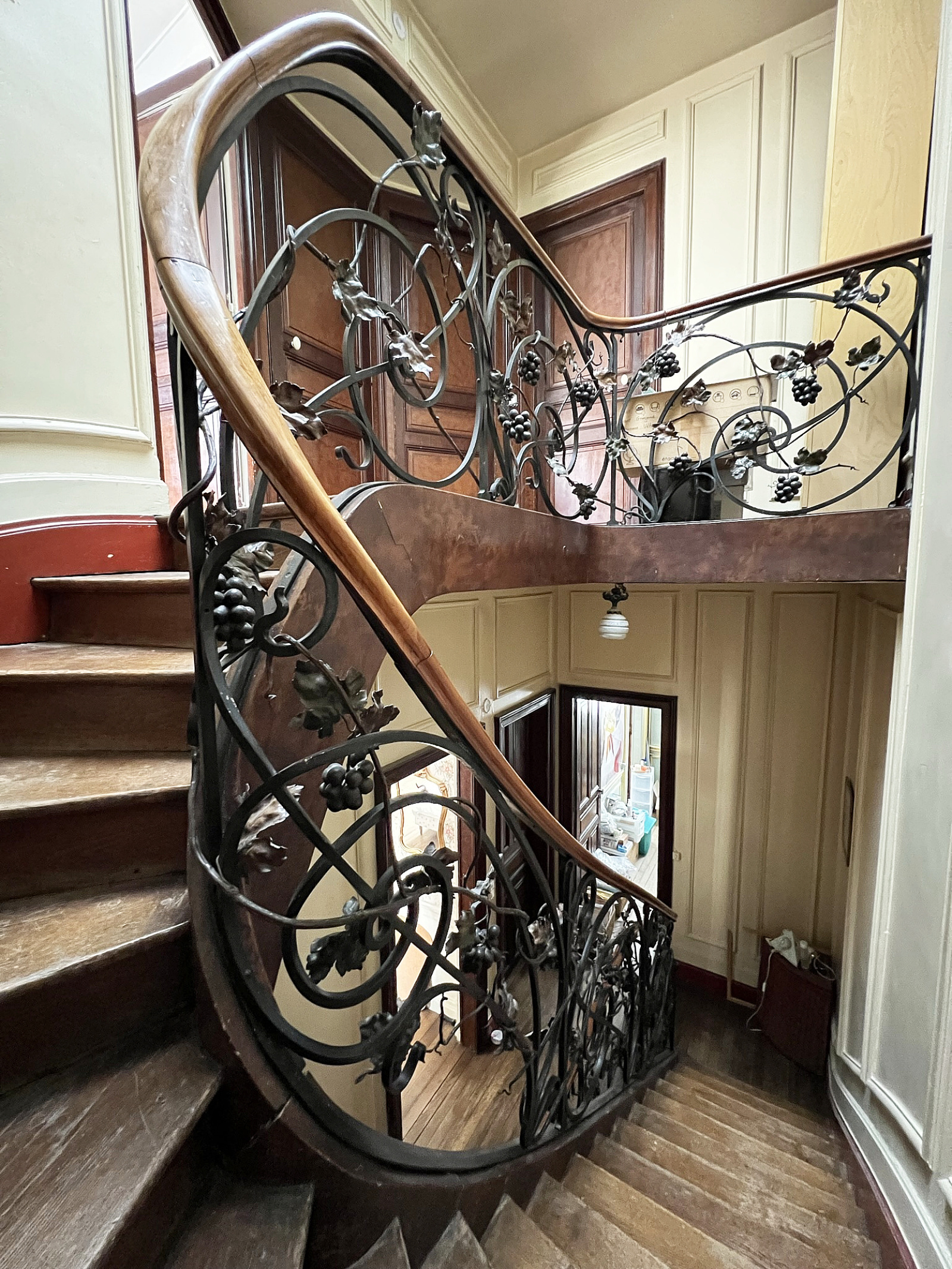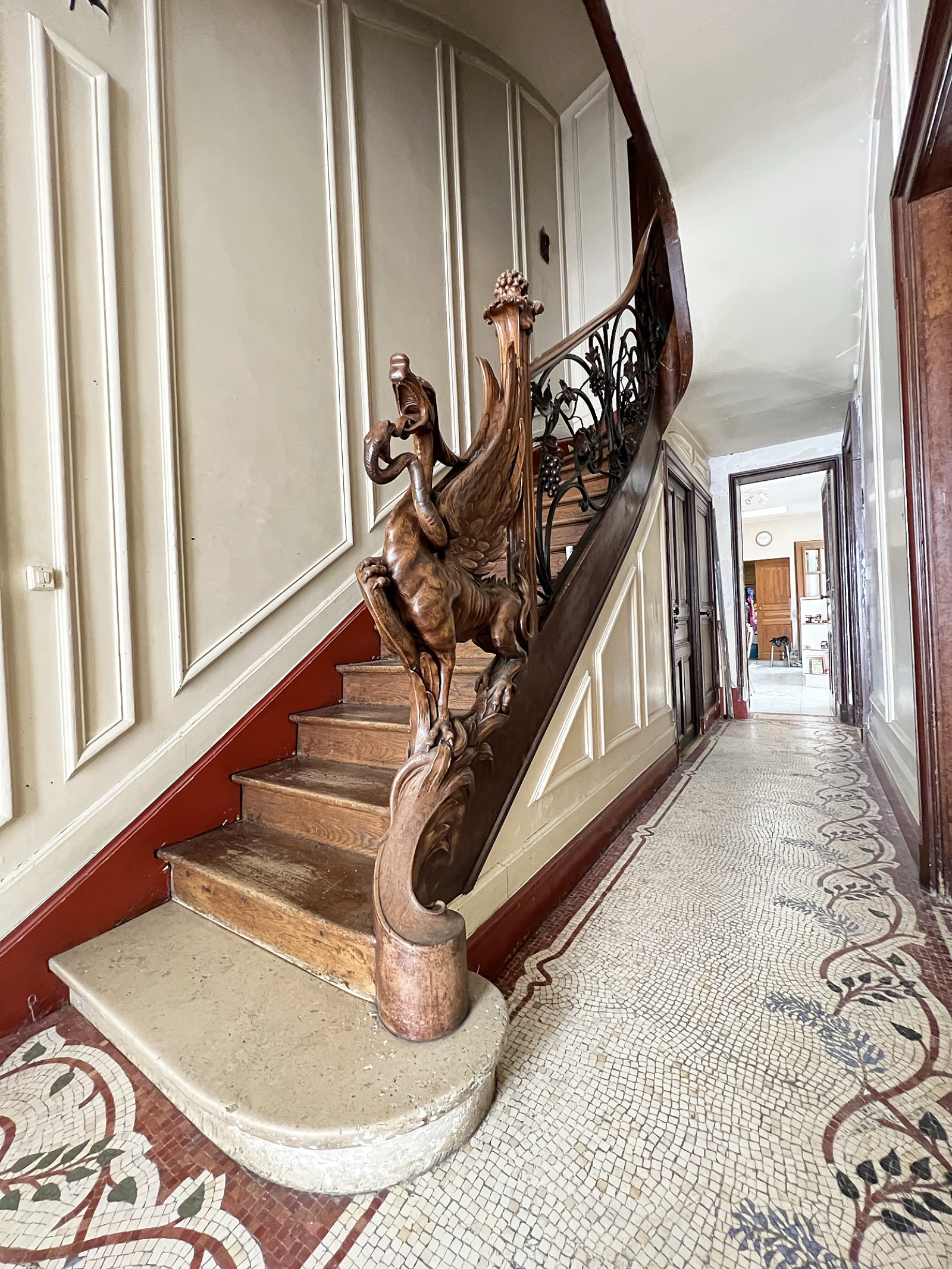 Moulures, cheminées, cimaises, parquets, verreries, mosaïques, une rampe d’escalier incroyable ornée d’une sculpture en bois et d’une descente en fer forgé à l’essence Champenoise.