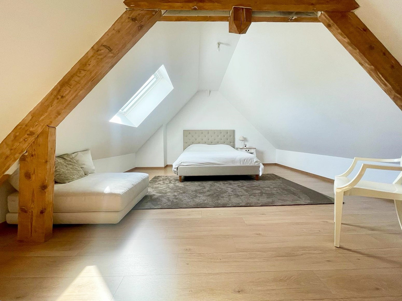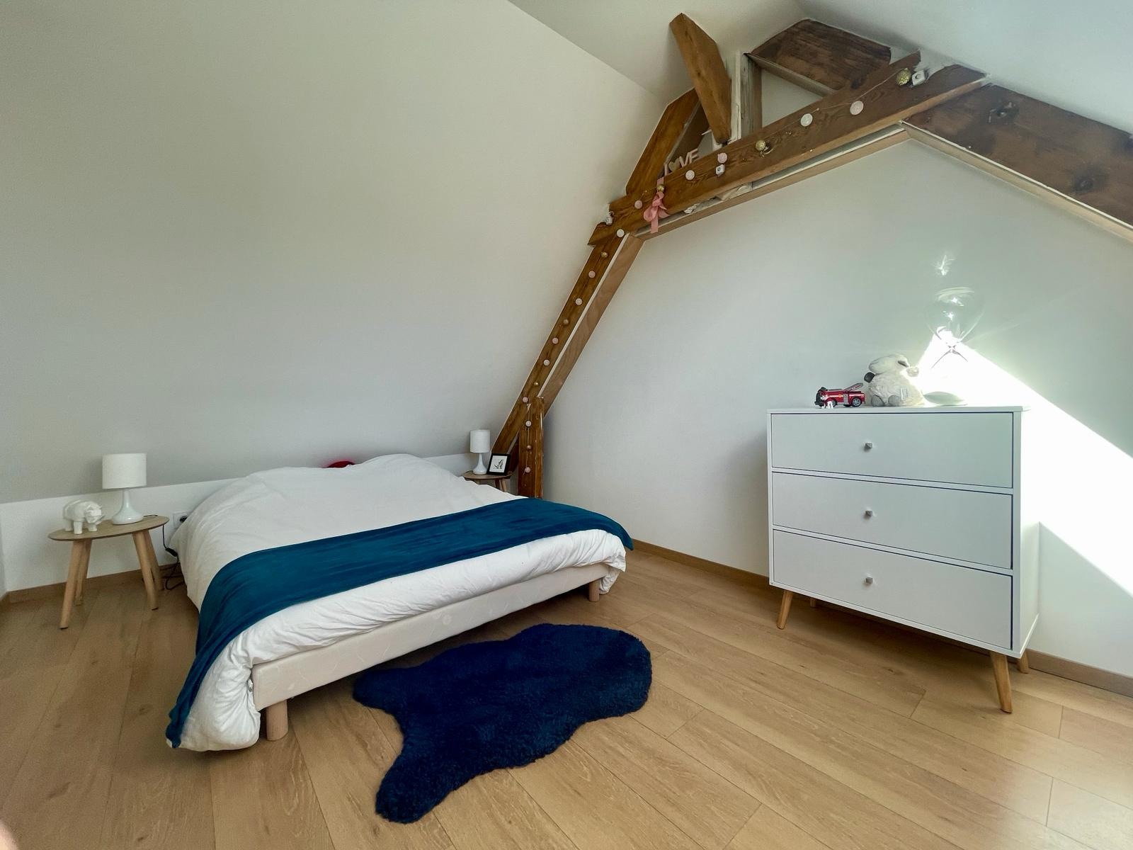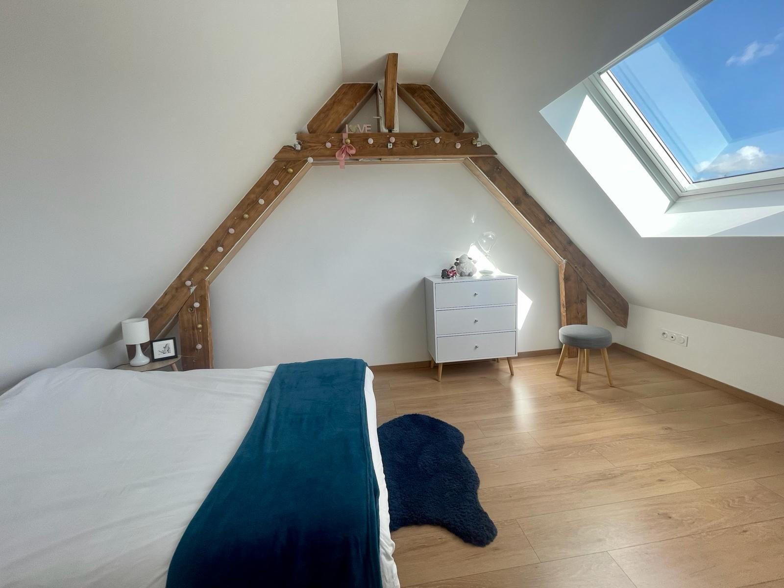 A l'étage supérieur, le grand palier dessert un bureau, des rangements, une salle de bains, suivi d'une grande chambre avec de belles poutres apparentes.