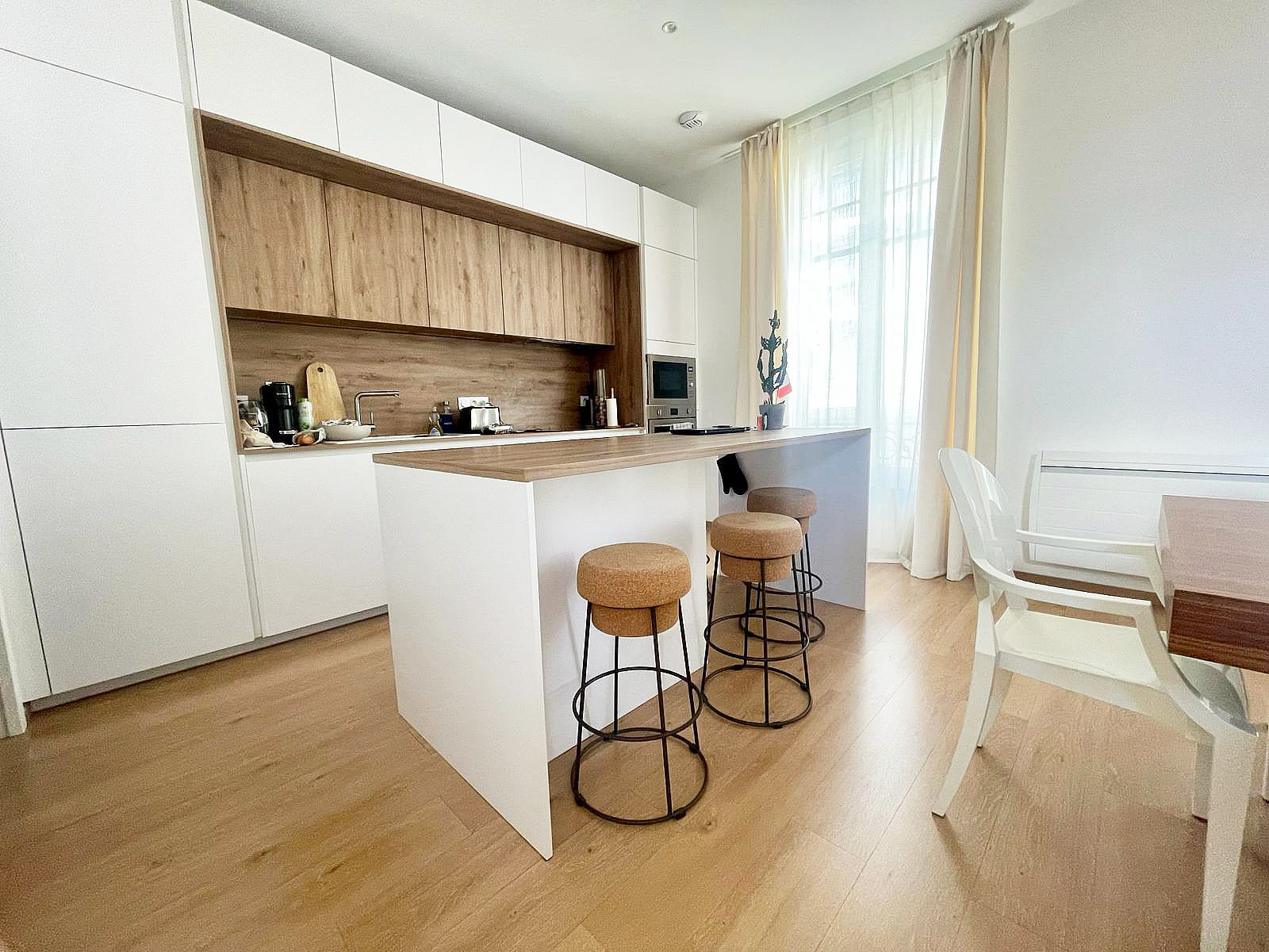Une entrée qui dessert la grande pièce de vie ainsi que sa cuisine entièrement équipée et meublée.