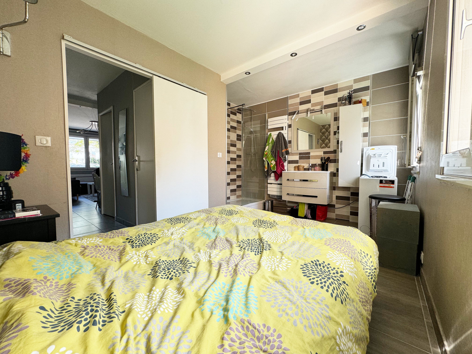 Entrée avec deux placards, pièce de vie avec cuisine ouverte aménagée et équipée, wc suspendu séparé, chambre avec salle d'eau et placard.