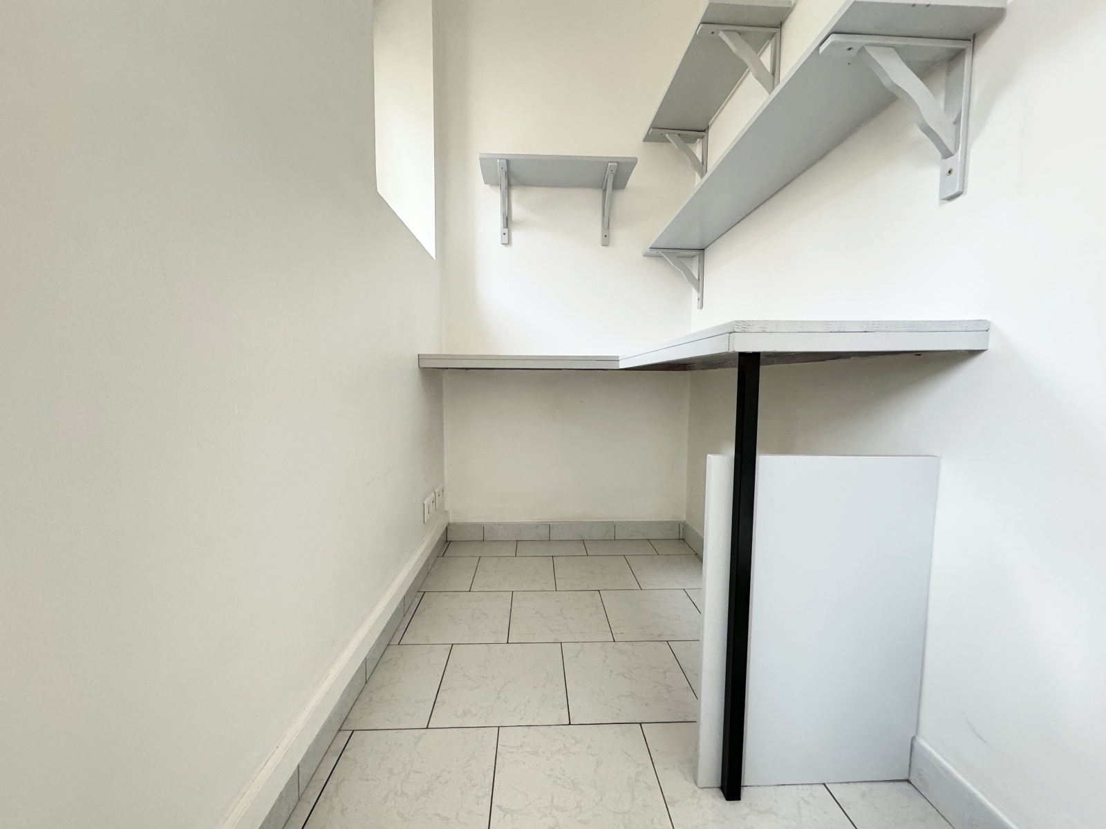 Comprenant : Coin kitchenette ouvert sur le salon avec placard, chambre avec coin bureau, salle de bains avec wc.
