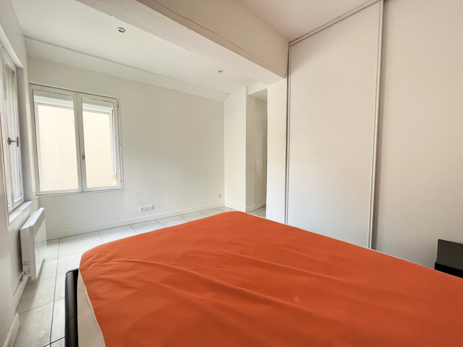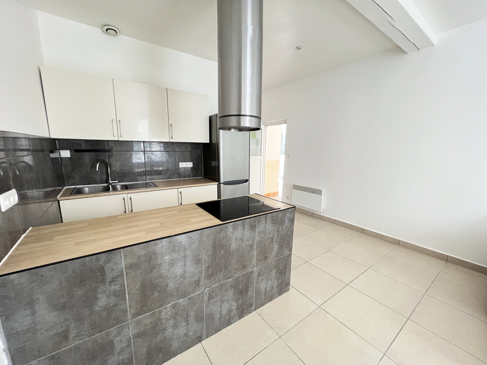 Séjour avec cuisine ouverte aménagée et équipée de plaque et hotte, chambre avec placard, salle de bains avec wc.