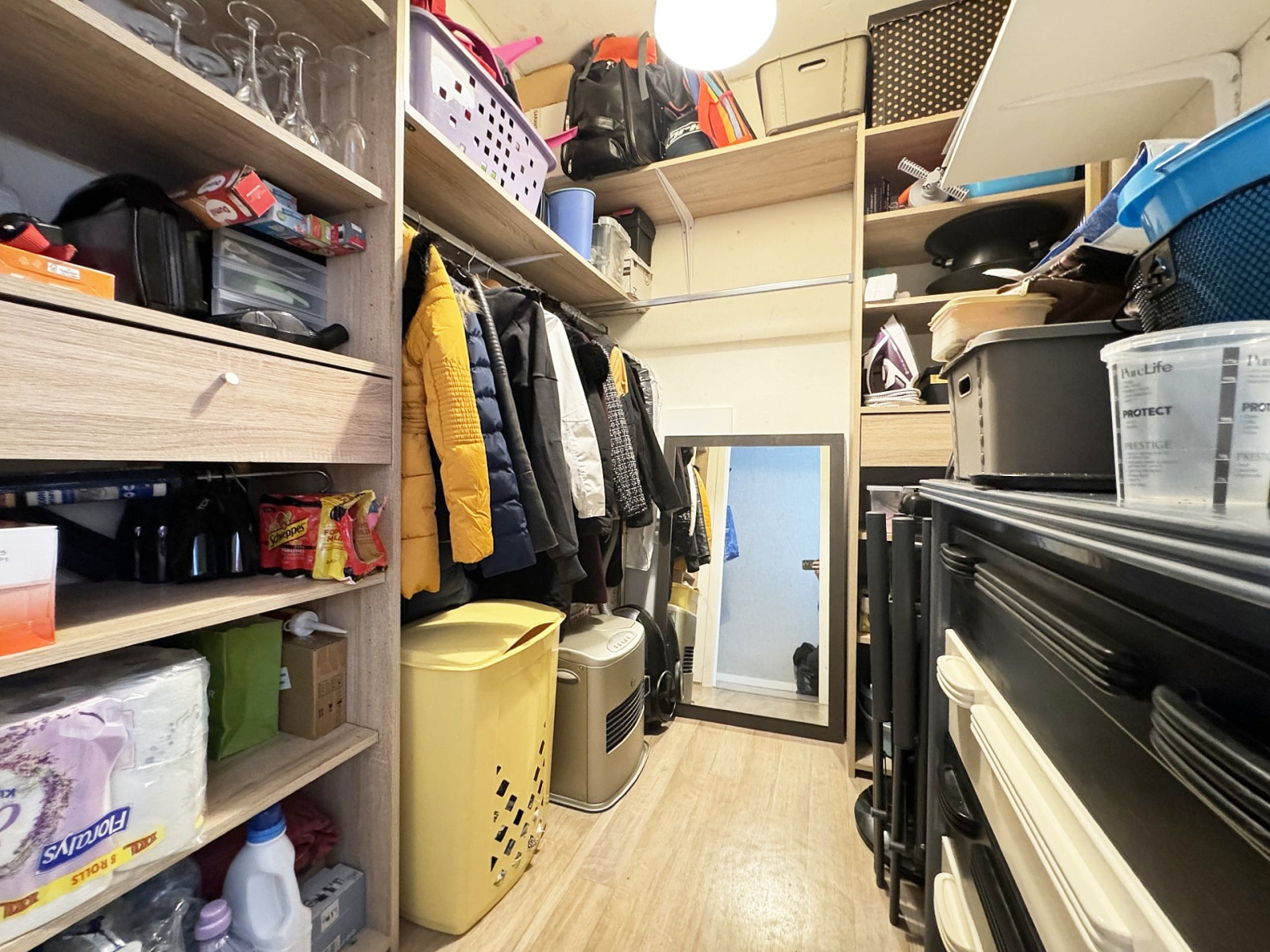 Entrée, pièce de rangement (3.60 m²), cuisine entièrement aménagée et équipée ouverte sur le salon, deux chambres, salle de bains, wc séparé.