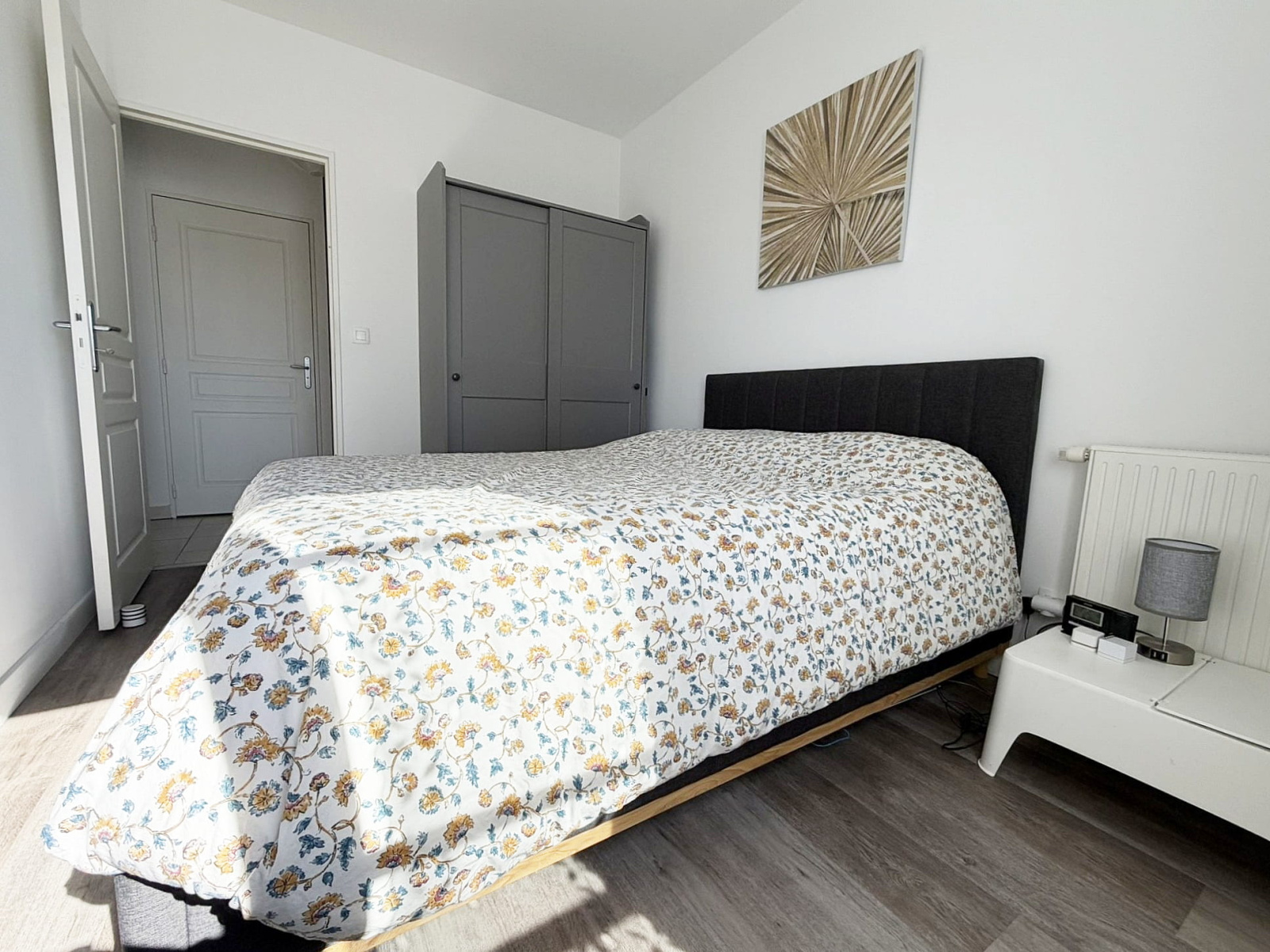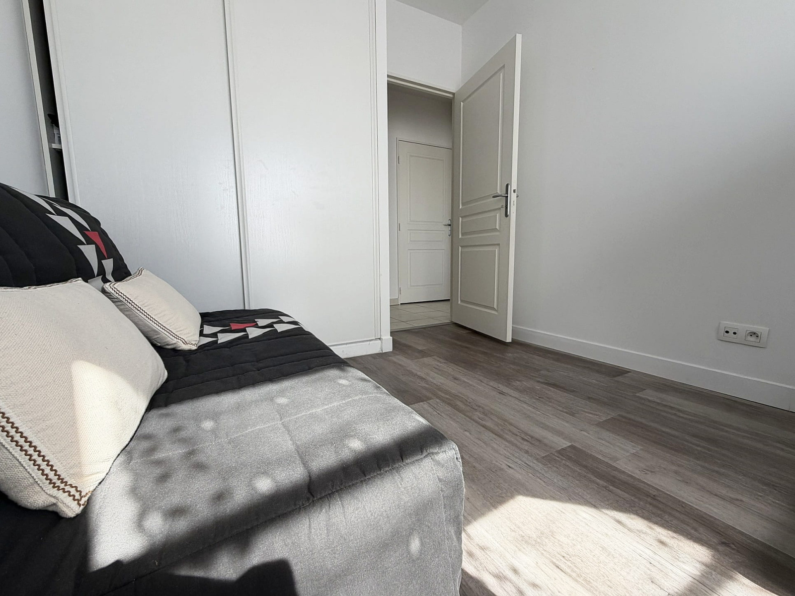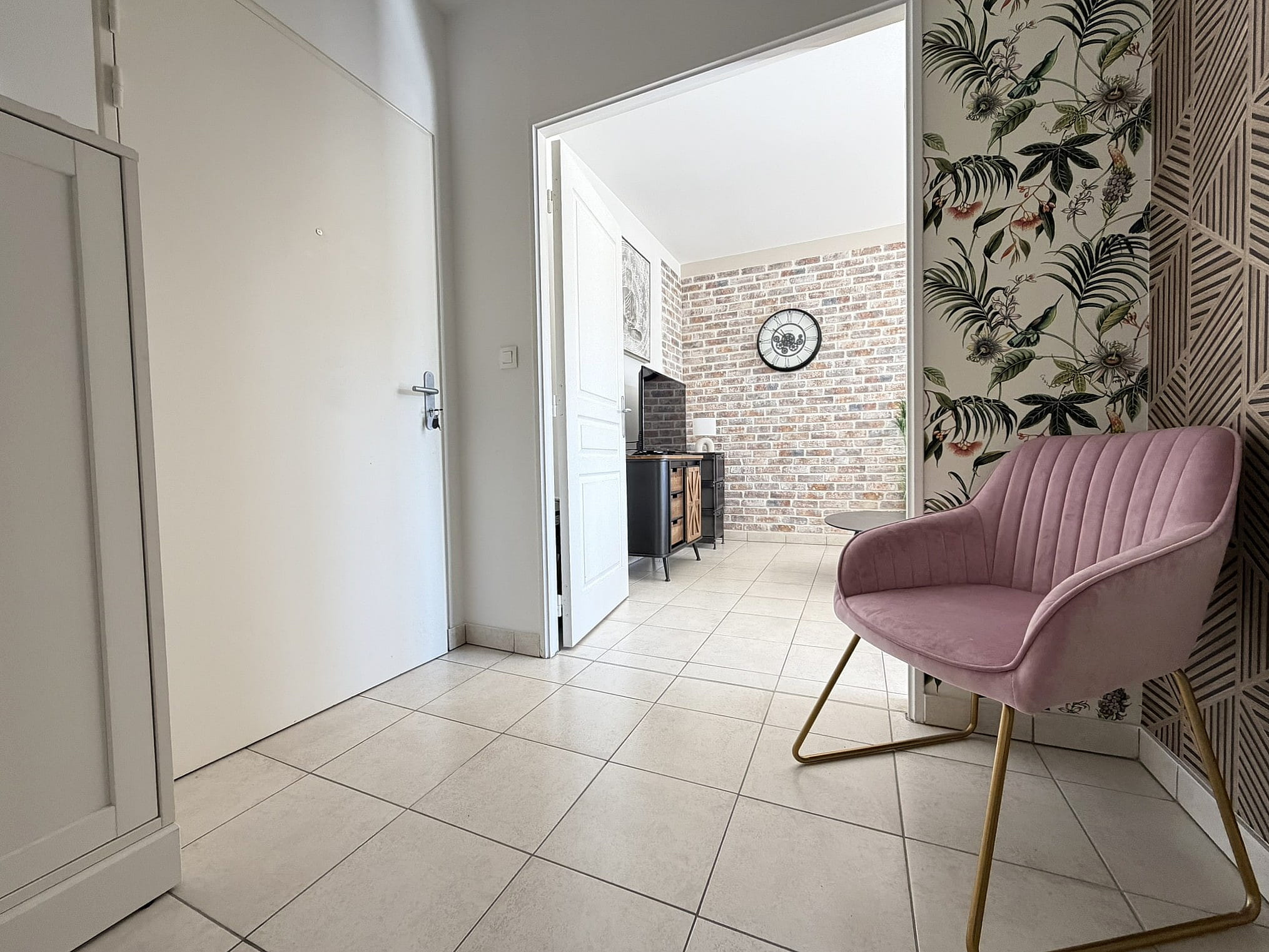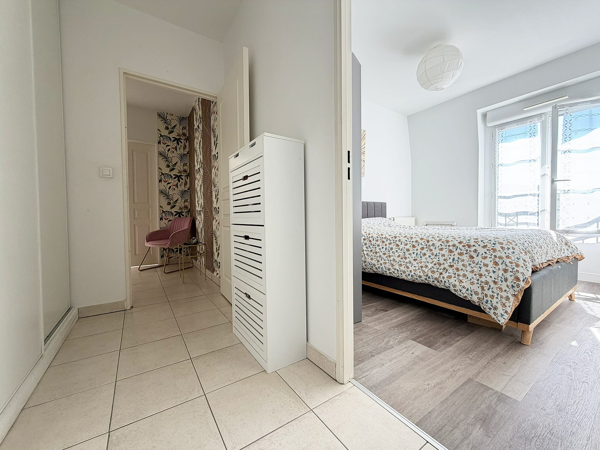 Entrée, salon avec cuisine américaine entièrement équipée, couloir avec placard, deux chambres (dont une avec placard), salle de bains, wc séparé.