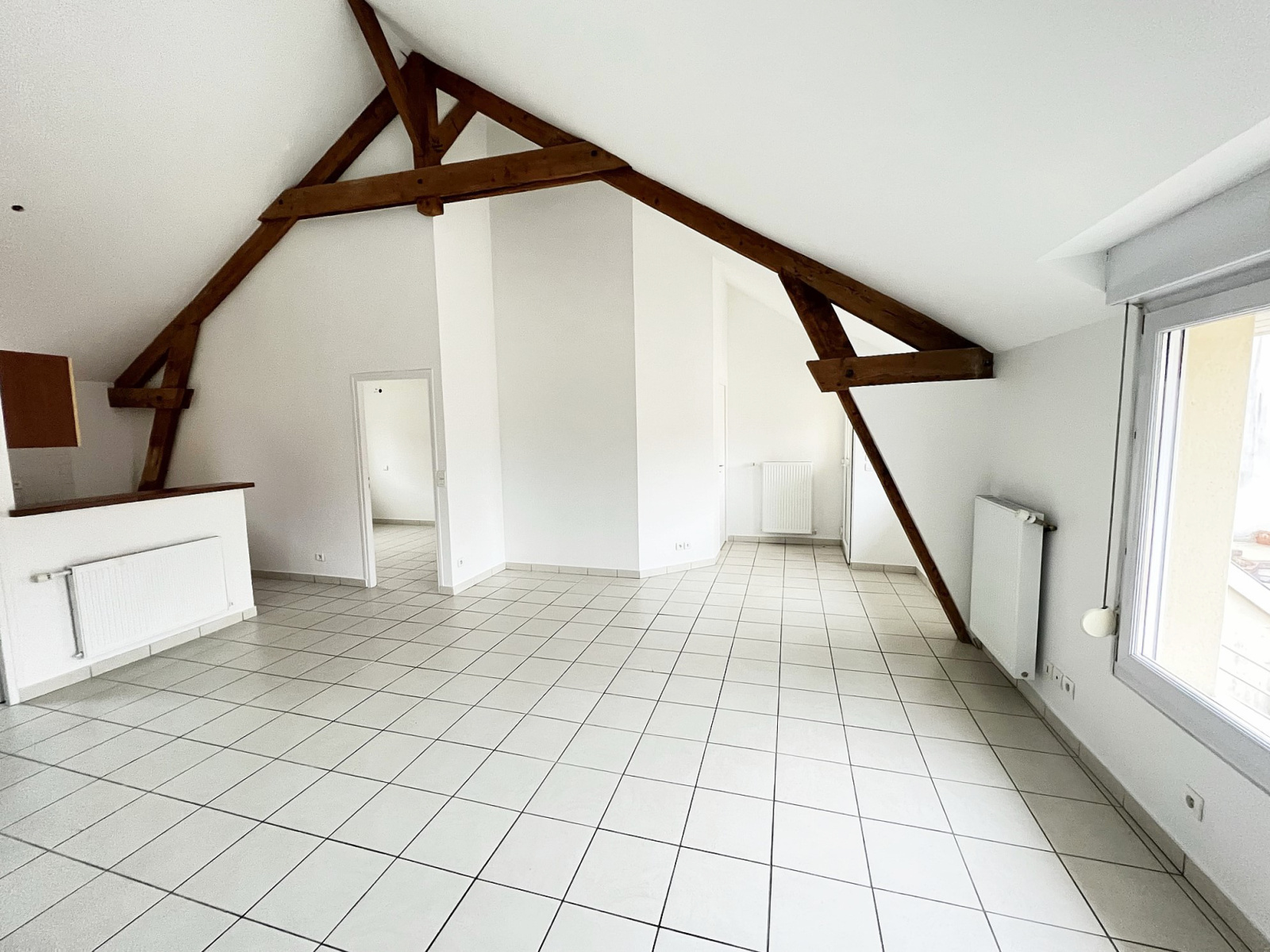 Entrée avec placard/rangement, magnifique volume du séjour avec cuisine ouverte semi-équipée (46,89 m²), 2 chambres, salle de bains, wc séparé avec emplacement machine à laver.