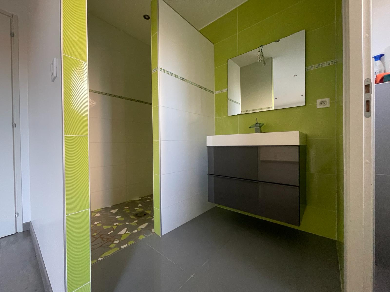 Une salle de bains, ainsi qu'un grand placard de rangement.
