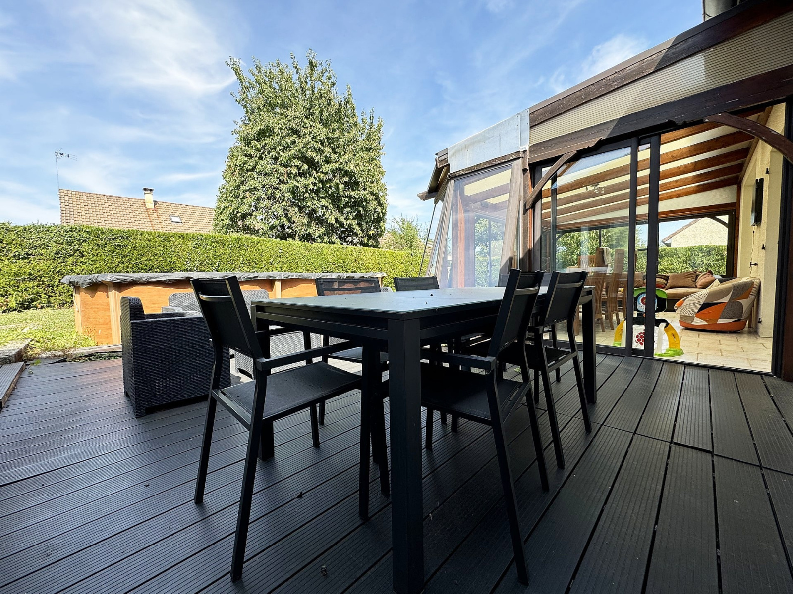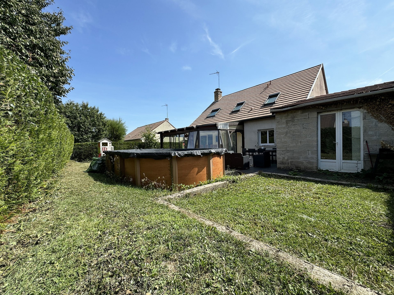 Beau jardin sans vis à vis, grand garage de 45 m², piscine hors sol.