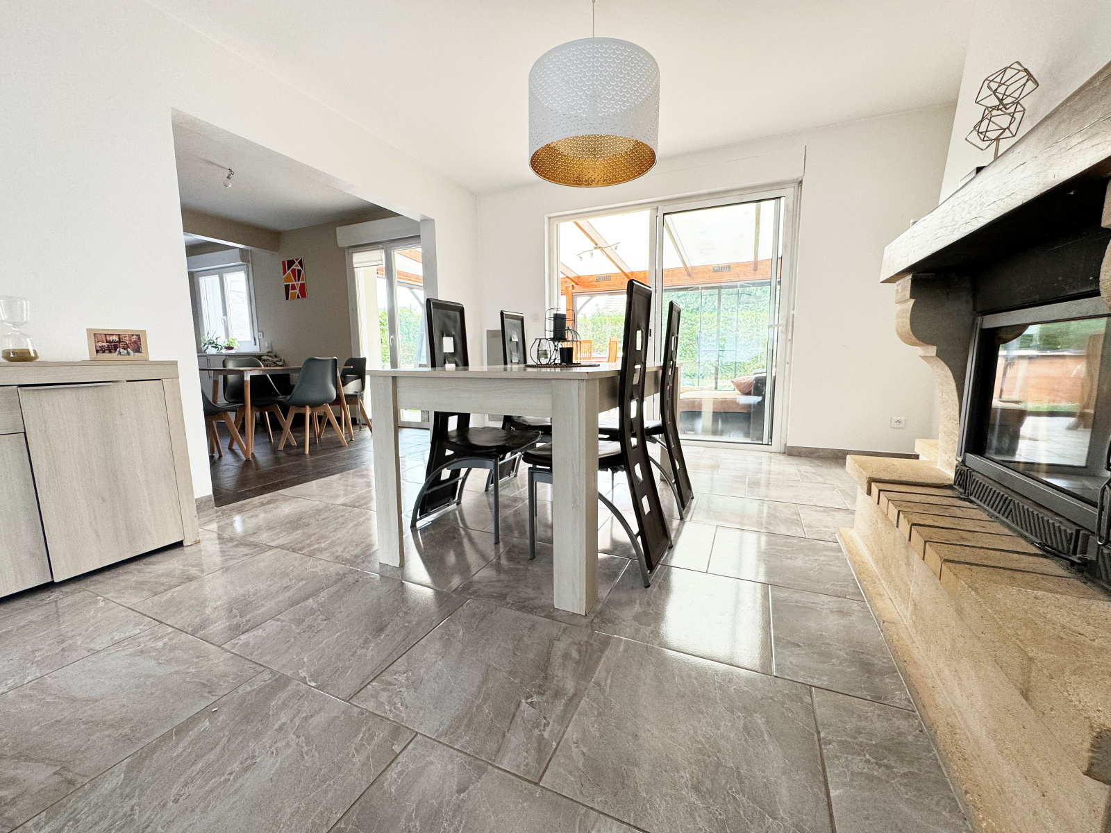 • au rez-de-chaussée : Entrée avec placards, séjour double avec cheminée insert, un espace cuisine aménagée et équipée de 16 m², une spacieuse véranda chauffée de 25 m², wc séparé et sa pièce de 21 m² à aménager.
