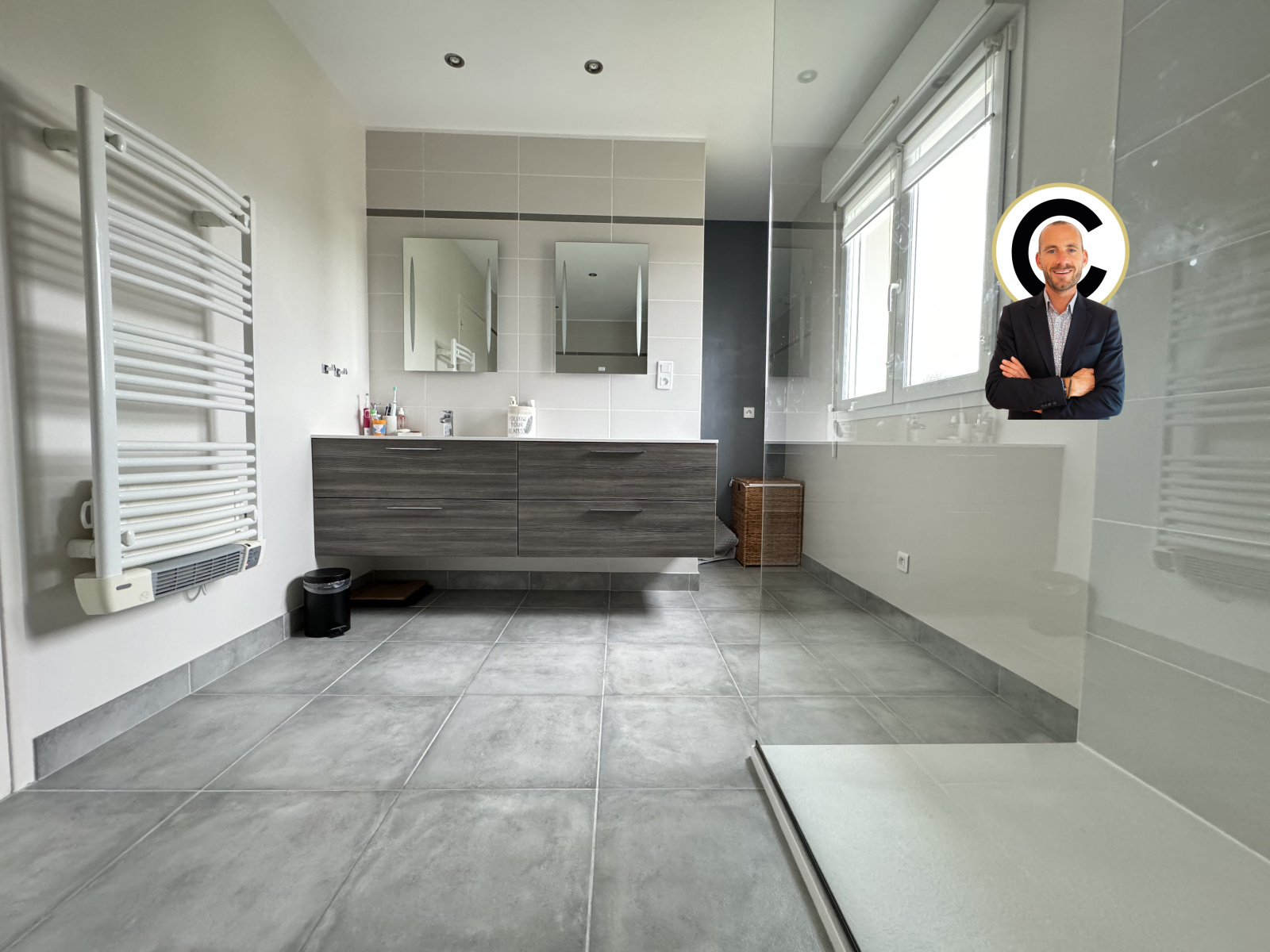 Au 1er étage: Palier, 4 chambres dont une avec une salle d'eau, une salle de bains avec douche et baignoire + wc.